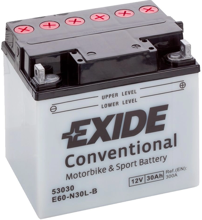 The E60-N30L-B is a high quality battery from Exide. The cold cranking current of the battery is 300 A. The dimensions of the product are 185 x 130 x 170 mm. You should use the dimensions of your old battery as a guide for your selection.Reliable wet cell technology for your vehicleThe E60-N30L-B has a capacity of 30 Ah. The higher the value, the more electrical charge can be stored in the battery.Wet batteries like the E60-N30L-B are conventional flooded models suited for motorcycles. They deliver dependable power and may require checks.You should consider this when buying