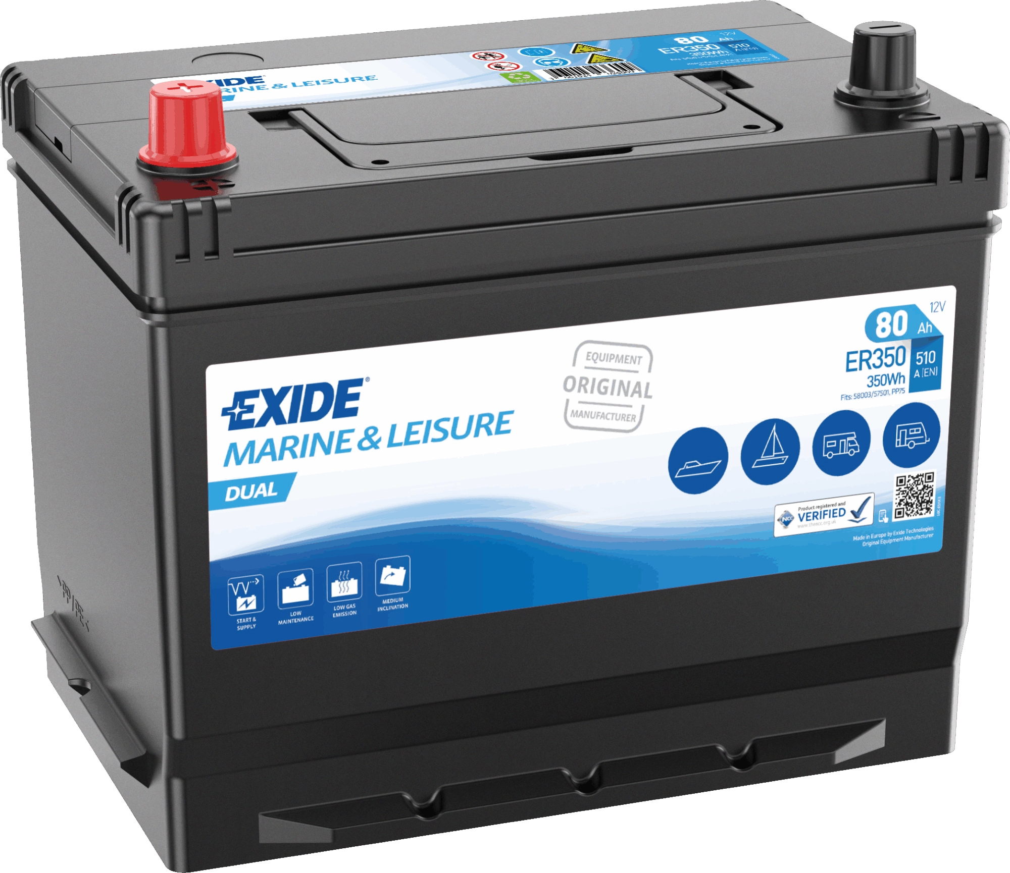 ER350 is a high quality battery from Exide. The cold cranking current of the battery is 510 A. The dimensions of the product are 270 x 173 x 222 mm. You should use the dimensions of your old battery as a guide for your selection. Durable Flooded technology for your vehicle The ER350 has a capacity of 80 Ah. The higher the value, the more electrical charge can be stored in the battery. Flooded batteries like the ER350 are suitable for marine dual use with standard energy needs. They offer reliable performance for marine applications. The technology of this battery supports dual starting and supply requirements in marine environments. You should consider this when buying Before you buy, check that the circuit and polarity of your new battery are identical to the values of the old model. The circuit shows whether the positive pole is on the right or left of the battery. To determine this, position the battery so that the poles are facing you. With the ER350, the circuit is 1, so the positive pole is on the left.