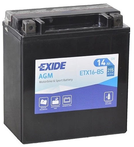 The ETX16-BS is a high quality battery from Exide. The cold cranking current of the battery is 215 A. The dimensions of the product are 150 x 90 x 160 mm. You should use the dimensions of your old battery as a guide for your selection.Durable MF technology for your vehicleThe ETX16-BS has a capacity of 14 Ah. The higher the value, the more electrical charge can be stored in the battery.MF batteries like the ETX16-BS are sealed and maintenance-free, ideal for motorcycles. They provide reliable performance and good vibration resistance.You should consider this when buying
