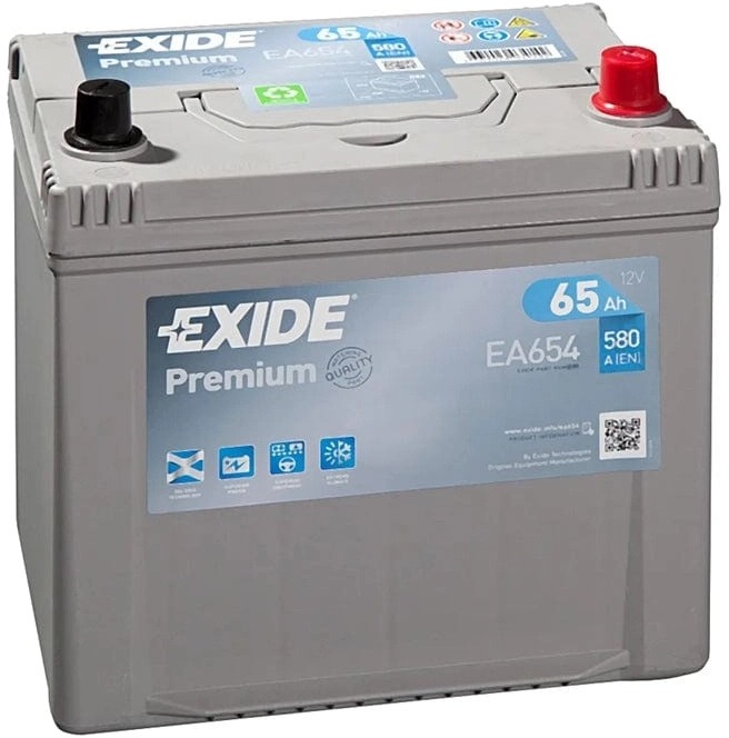 The EA654 is a high quality battery from Exide. The cold cranking current of the battery is 580 A. The dimensions of the product are 230 x 173 x 222 mm. You should use the dimensions of your old battery as a guide for your selection. Durable Wet technology for your vehicle The EA654 has a capacity of 65 Ah. The higher the value, the more electrical charge can be stored in the battery. Wet batteries like the EA654 are suitable for standard vehicles with everyday energy needs. They offer reliable performance for conventional automotive use. The technology of this battery supports basic starting and power requirements. You should consider this when buying Before you buy, check that the circuit and polarity of your new battery are identical to the values of the old model. The circuit shows whether the positive pole is on the right or left of the battery. To determine this, position the battery so that the poles are facing you. With the EA654, the circuit is 0, so the positive pole is on the right.