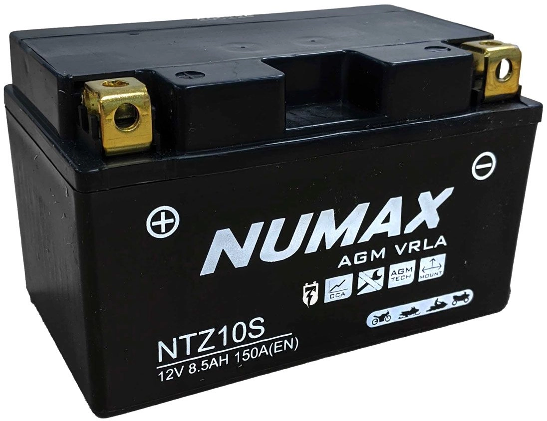 The NTZ10S is a high quality battery from Numax. The cold cranking current of the battery is 150 A. The dimensions of the product are 151 x 87 x 94 mm. You should use the dimensions of your old battery as a guide for your selection.Durable AGM technology for your vehicleThe NTZ10S has a capacity of 8.5 Ah. The higher the value, the more electrical charge can be stored in the battery.AGM batteries like the NTZ10S are suitable for motorcycles with high energy requirements. They have a long cyclic life and are vibration-resistant.You should consider this when buyingBefore you buy, check that the circuit and polarity of your new battery are identical to the values of the old model. The circuit shows whether the positive pole is on the right or left of the battery. To determine this, position the battery so that the poles are facing you. With the NTZ10S, the circuit is 1, so the positive pole is on the left.