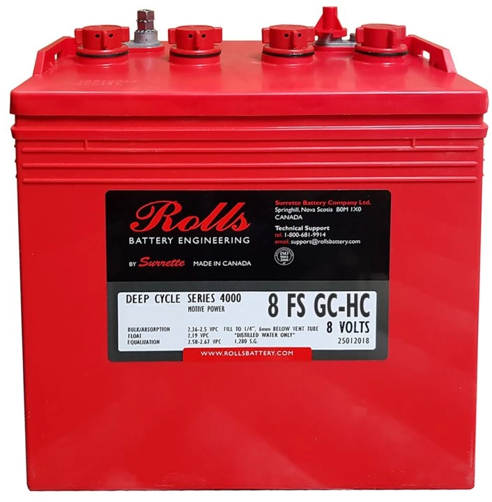 8FSGC-HC is a high quality battery from Rolls. The cold cranking current of the battery is 182 A. The dimensions of the product are 259 x 181 x 279 mm. You should use the dimensions of your old battery as a guide for your selection. Reliable Flooded Lead-Acid technology for your vehicle The 8FSGC-HC has a capacity of 144 Ah. The higher the value, the more electrical charge can be stored in the battery. Flooded Lead-Acid batteries like the 8FSGC-HC are designed for deep cycle renewable or marine use, providing long-lasting power. You should consider this when buying Before you buy, check that the circuit and polarity of your new battery are identical to the values of the old model. The circuit shows whether the positive pole is on the right or left of the battery. To determine this, position the battery so that the poles are facing you. With the 8FSGC-HC, the circuit is N/A.